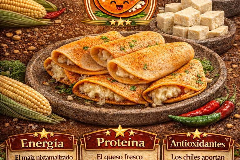 El queso fresco aporta proteína y minerales, mientras que el maíz nixtamalizado aporta energía, fibra y calcio.